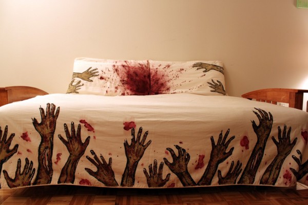 Designed by Melissa Christie these creepy sheets have screen printed Zombie arms with hand painted details, along with appliquéd hands on pillows.