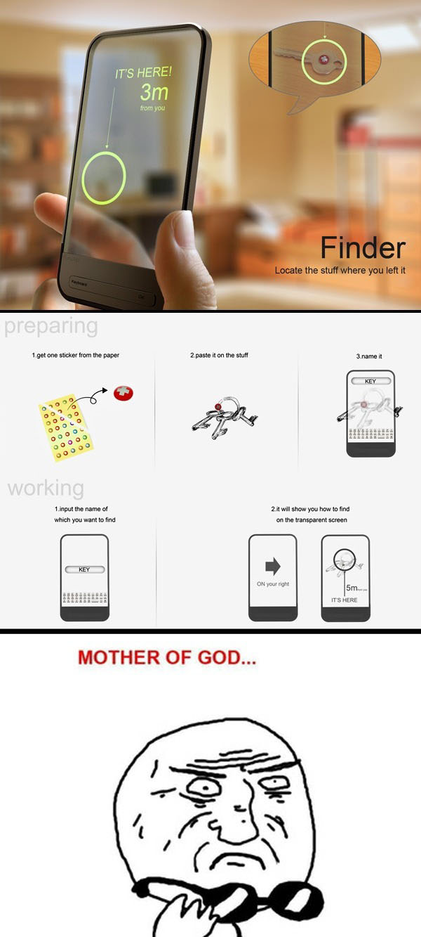 Designers Chu Wang, Qiujin Kou, Qian Yin & Yonghua Zhang have come up with this RFID enabled finder gadget. The next step is obviously to make a finder to help find the finder gadget!